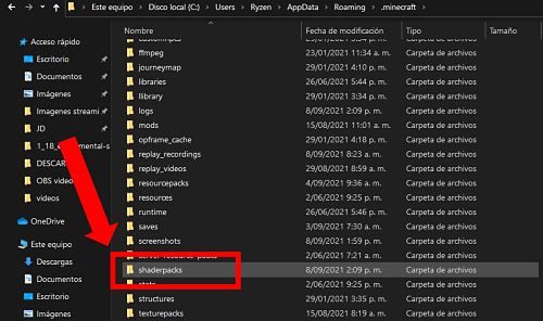 Abrir carpeta shaders de minecraft Windows 10
