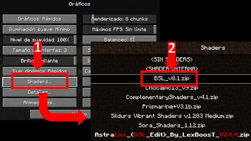 Ahora solo queda poner los shaders al mundo que tengas y es tan fácil como entrar a opciones, gráficos, shaders y seleccionar los BSL. Así de simple es.